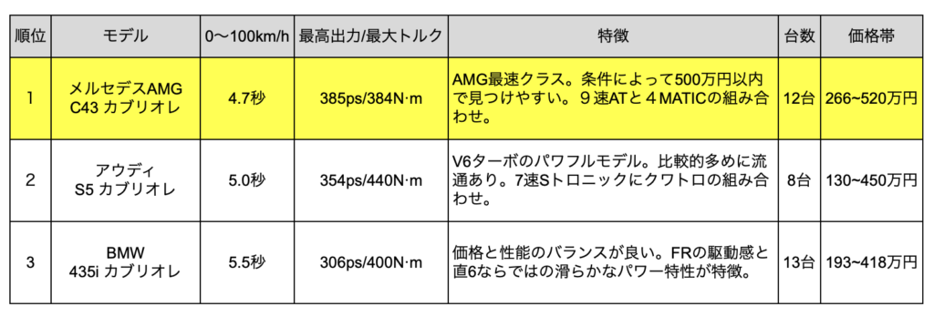 加速のベンチマークとなる 0-100km/h で調べてみると、最も速かったのが”メルセデスAMG C43カブリオレ”、次いで”アウディ S5カブリオレ”、”BMW 435iカブリオレ”と綺麗に3社並びました。スポーツ性能で言えばBMWというイメージですが、今回は500万円以下で購入可能という条件をつけたところ、M440iが対象から外れてしまったため、メルセデスAMGを含めた比較だと少しナンセンスだったかも知れません。2026年2月時点での中古車情報サイトに掲載されている車両情報を元にすると、440iカブリオレについては、0−100が5.2秒性能は上がりますが、販売台数が1台しかなく、順位が変わるわけではないために対象から外させてもらいました。