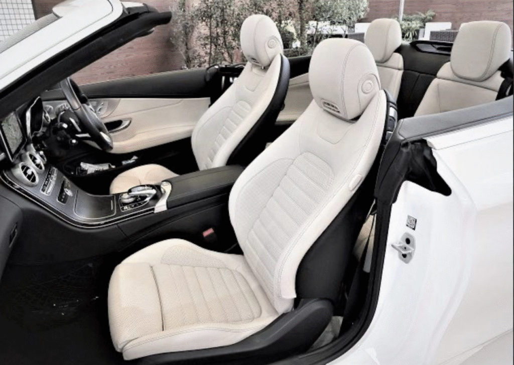 C43カブリオレは外観・内装ともAMGらしいスポーティさと上質感が特徴です。コックピットにはカーボンパネルや高級人工皮革ARTICOを採用し、快適さとラグジュアリー感を演出しています。