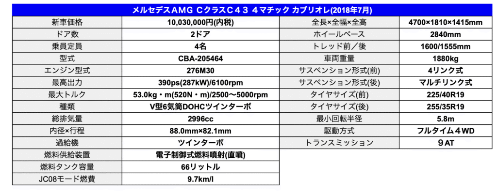 今回取り上げたC43カブリオレは、W205型を前提としております。こちらは「3.0L V6ツインターボ+9速AT」「4WD(4MATIC)」という基本構成を維持しつつ、マイナーチェンジによって出力・燃費・制御の最適化が図られています。特に2018年のマイナーチェンジを境にエンジン出力や装備、燃費面で違いが現れます。以下、代表的な年式ごとにその走行性能と燃費の違いをまとめました。